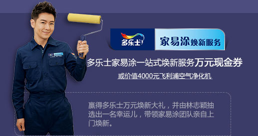 “萬元煥新大禮”:由網友票選得出,每周累計票數排名前2名的用戶。并有機會由林志穎抽選出一名幸運兒,帶領家易涂團隊親自上門煥新。注:此活動的票數統計以累計票數為準;參與過中獎者不得再次參選后續的評選活動。通過溫馨而有趣的互動情節,體驗多樂士煥新它不僅僅只是墻面的換色,更能增進夫妻間的和睦關系,讓愛升華!還在等什么,快來參與吧!通過多樂士有一個全新的升華和遞進。還在等什么,快來參與吧!